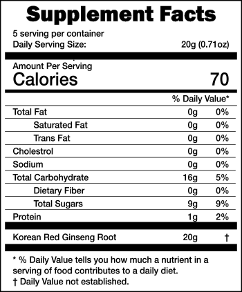 - Ingredients: Red ginseng root 100%, Honey (from Korea) 24.5%, Isomalito-oligosaccaride